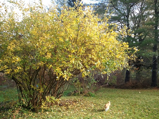 Cat under the forsythia tree